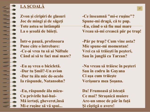 Vreau si eu poezii amuzante despre scoala sa mor de ras. Chiar mincinos si rece este focul lumii. Profesorii te nvata acolo multe lucruri valoroase care n viata s necesare. Ti am pregatit o lista cu cele mai interesante poezii pentru copii.