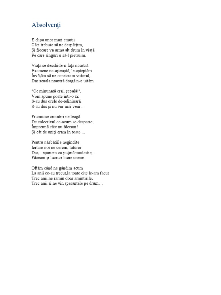 Poezi despre scoala si profesori. Sunt 4 poezii interesante despre scoala si anume. 11 noiembrie 2006 08 49. Alfabetul viu invatatoarea abecedarul matematica. Funda buna crezul elevuluicred intr una sfanta matematicamateria tuturor notelor relefacatoarea tuturor problemelordezlegate si nedezlegatesi intr una sfanta geometriecare din matematica se tragemaine inainte de toate obiectelelumina ntunecatasi stiinta blestematacare de o fiinta cu contabilitateaprin care toate s au facutcare pentru.