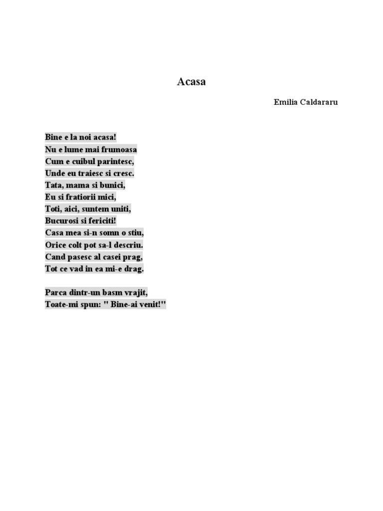 Sublinierea si explicarea cuvintelor necunoscute. Bine e la noi acasă. Aceast frumoasa poezie este scrisa de emilia caldararu. Casa mea și n somn o știu orice colț pot să l descriu.