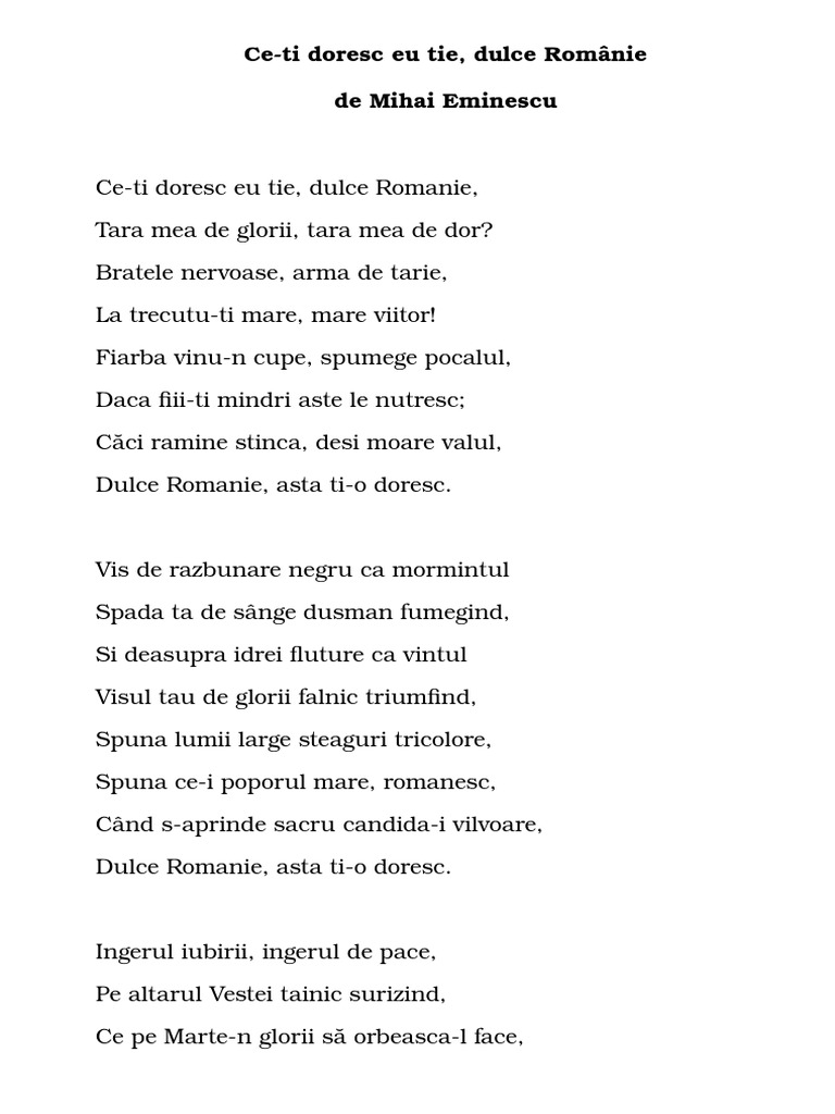 Braţele nervoase arma de tărie la trecutu ţi mare mare viitor. Ce ţi doresc eu ţie dulce românie mihai eminescu 21 06 2020 30 06 2020 venin dulce niciun comentariu. înainte de această traducere avuse însă un succes neașteptat. Spiritualitatea romaneasca reinviata in aceasta poezie este spiritualitatea din care nu ne am trezit noi s au trezit secolii din urma noastra si ne au scuturat din somn.