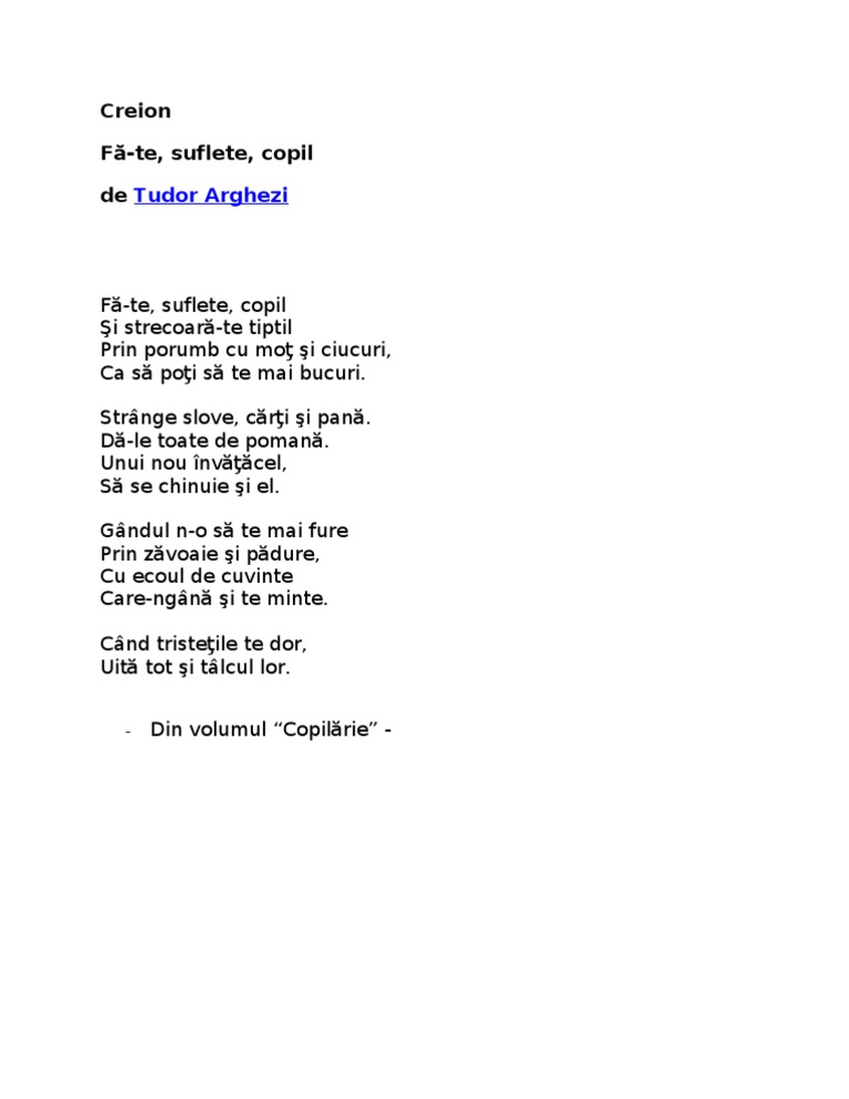 Poezia creion de tudor arghezi. Limbajul utilizat de tudor arghezi în versurile poeziei creion se distinge în literatura română fiind folosit într o manieră plastică. Poeme noi creion aceasta pagina a fost accesata de 1597 ori. Fă te suflete copil și strecoară te tiptil prin porumb cu moț și ciucuri ca să poți să te mai bucuri. Obrajii tăi mi s dragi cu ochii lor ca lacul în care se oglindesc.