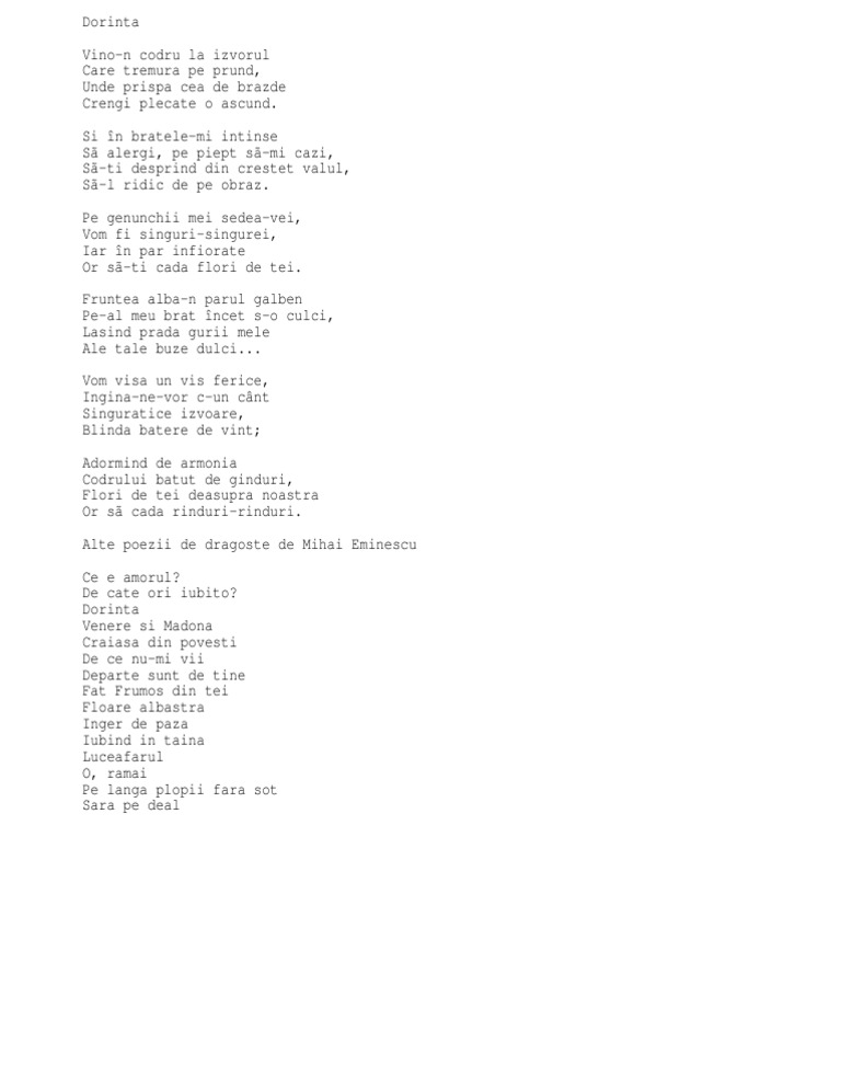 şi în braţele mi întinse să alergi pe piept să mi cazi să ţi desprind din creştet vălul să l ridic de pe obraz. Poezie de dragoste mihai eminescu dorinta. Fruntea albă n părul galben pe al meu braț încet s o culci. Pe genunchii mei sedea vei vom fi singuri singurei iar în par infiorate.