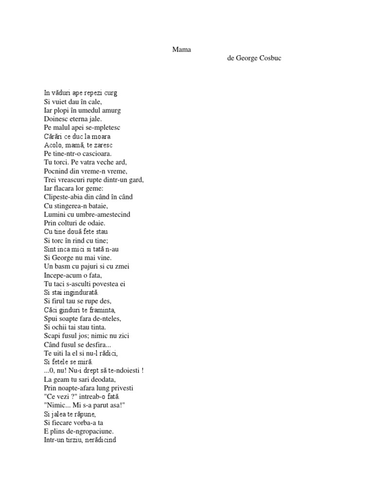 Mama in văduri ape repezi curg si vuiet dau în cale iar plopi în umedul amurg doinesc eterna jale. De george coșbuc george cosbuc 2002 09 29. Versuri mama de george coșbuc. Romanian poetry george cosbuc poezii românesti.