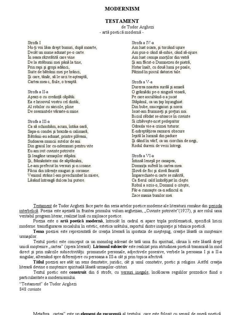 Tudor arghezi testament comentariu literar poezia testament reprezintă o foaie de parcurs pentru urmași care se succed în ritmul vieții făcând loc generațiilor viitoare însă care se alimentează din trecutul națiunii. Theodorescu al cărui supranume de scriitor este derivat de la vechea denumire a răului argeș argesis. Testament tudor arghezi perioada literara. în cazul nostru poetul este un reprezentant social ce transpune în poezie trăirile sufletești ale poporului său.