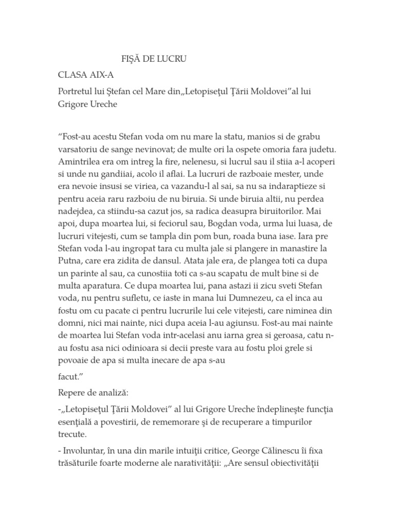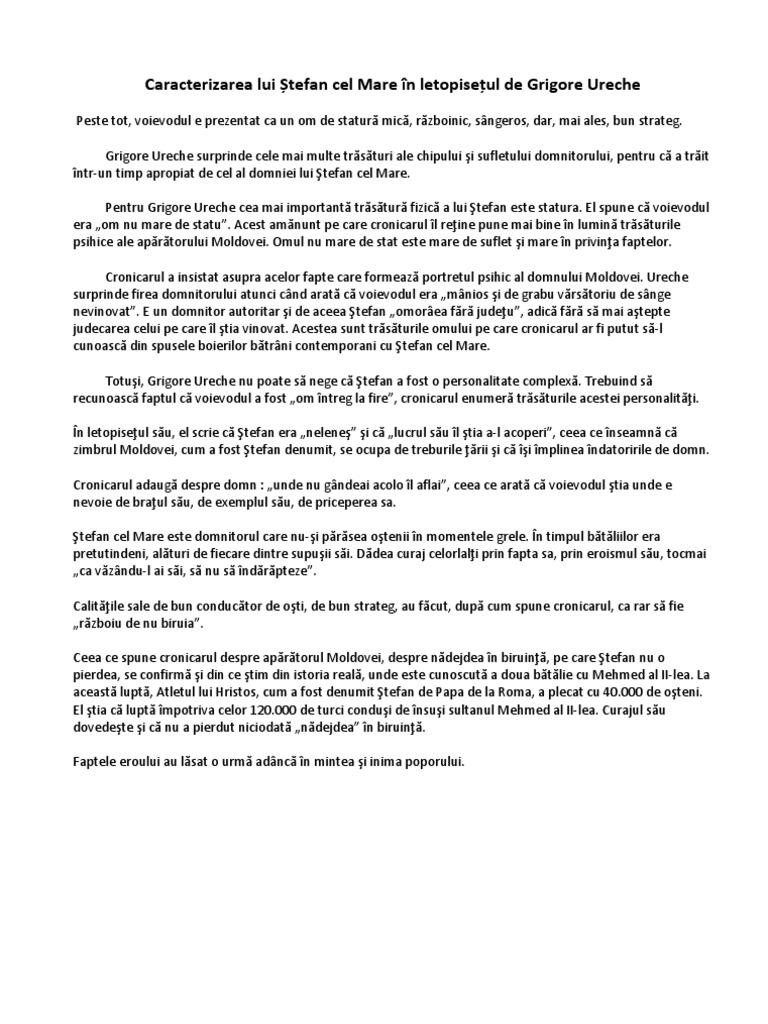 ştefan cel mare şi sfânt portret în istorie 12 p. în textul lui grigore ureche este descris ca o persoană nu mare de stat iar în cel al lui mihai sadoveanu este descris ca fiind scund de statură. Acest citat aparţine lui grigore ureche citat în care figura eroică a lui ştefan cel mare e puternic reliefată si apare ca un simbol antiturcesc pentru secolul in care a trăit grigore ureche. Au lăsat pre acel mai mare ca să o judece şi ce i au părut lui ori bine ori rău aceia au fost lege de unde au luat şi voie aşa mare şi vârf.