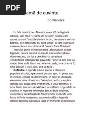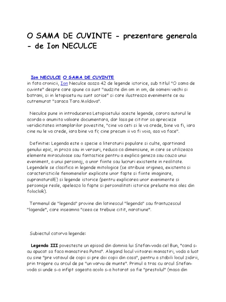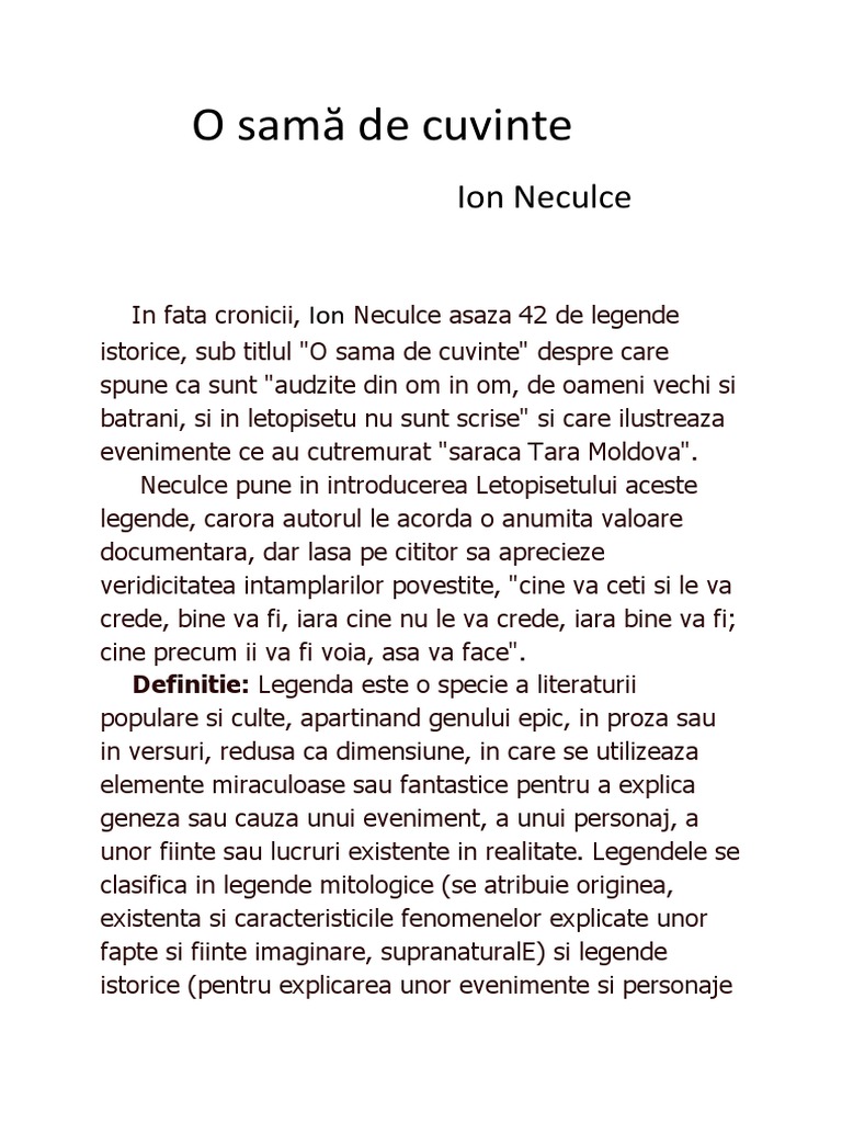 Portretul lui stefan cel mare o sama de cuvinte. Deși se aburca tot mai greu pe cal deși minuia sabia cu ceva mai puțină îndemânare ca n anii cei tineri viteazul voievod al moldovei n a știut ce i odihna până n ultimele zile ale vieții sale. Epoca lui stefan cel mare este epoca eroica povestita lumii neeroicecontemporane. Asa legenda despre ajutorul dat de purice aprodul lui stefan cel mare intr o lupta care explica numele familiei movila se afla in cronica lui stefan cel mare tradusa in limba germana. în faţa letopiseţului ion neculce aşează 42 de legende istorice sub titlul o samă de cuvinte despre care spune că sunt audzite din om în om de oameni vechi şi bătrâni şi în letopiseţu nu sunt scrise şi care ilustrează evenimente ce au cutremurat săraca ţară moldovă.