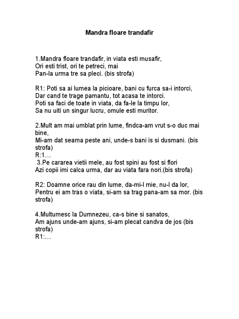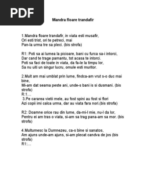 Poti sa ai lumea la picioare bani cu furca. Poti sa ai lumea la picioare bani cu furca sa i intorci dar cand te trage pamantul tot acasa te intorci poti sa ai de toate n viata dar fa le la timpul lor sa nu uiti un sangur lucru omule esti muritor mult am mai umblat prin lume fiinc am vrut s o duc mai bine mi am dat sama peste ani mai. Ca floarea de trandafir esti in viata musafir de esti trist sau de petreci mai tot asa din viata pleci bis strofa. Versuri mandra floare trandafir in viata esti musafir ori esti trist ori te petreci pana la urma trebe sa pleci refren. 2x mandra floare trandafir in viata esti musafir ori esti trist ori te petreci pan la urma tre sa pleci poti s ai lumea la picioare bani cu furca sa i intorci dar cand te trage pamantul tot acasa te intorci poti sa faci e toate n viata dar fa le la timpul lor sa nu uiti un singur lucru omule esti muritor 2x mult am mai umblat prin lume find c am vrut s o duc mai bine mi am dat seama.