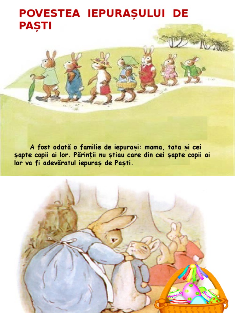Povestea iepurasului de pasti. Părinţii nu ştiau care din cei şapte copii ai lor va fi adevăratul iepuraş de paşti. 0 stele 0 review uri. A fost odată o familie de iepuraşi.