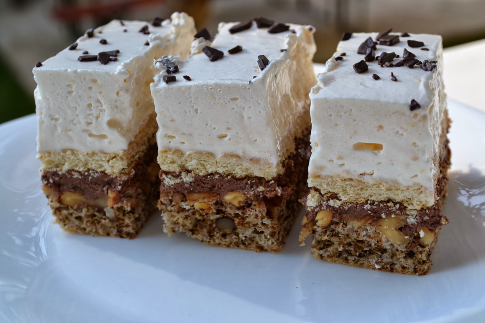 Albusurile se bat cu zaharul pana se obtine o spuma tare cand intorci vasul nu curge iar peste ele se adauga un amestec din nuca macinata faina si praful de copt.