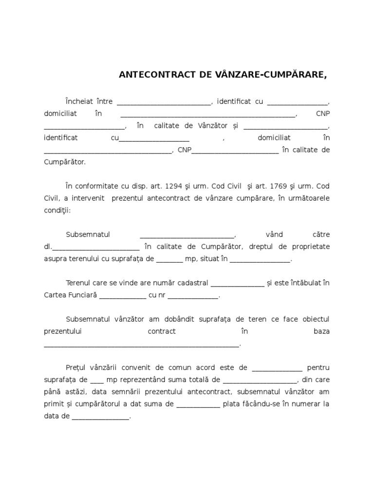 Daca de la nici unul din clienti nu cer avans ci doar plata topografului si dezmembrarii terenului si primirii de numar cadastral cum voi formula mai exact faptul ca daca ei renunta nu. Model antecontract de vânzare cumpărare părțile contractante se obligă să încheie contractul de vânzare cumpărare pentru apartamentul sus menționat. Construcţiile sub şi supraterane amplasate pe teren şi garantează pentru exactitatea acesteia. 660 mp teren de vanzare in domnesti ilfov eu vanzatorul declar sub sanctiunea prevazuta de art 292 cod penal ca terenul ce face obiectul acestui contract nu a mai fost vindut donat sau ipotecat in favoarea vreunei alte persoane fizice sau juridice si consimt la intabularea in cartea funciara a dreptului de proprietate al cumparatorului.