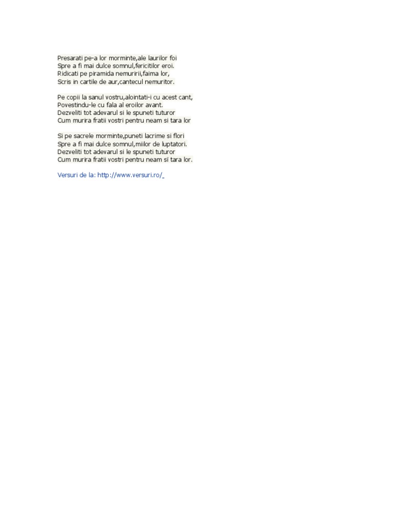 Imnul eroilor corul armatei presarati pe alor morminte ale laurilor foi spre a fi mai dulce somnul fericitilor eroi. Dezveliti tot adevarul si le spuneti tuturor cum murira fratii vostri pentru neam si tara lor si pe.