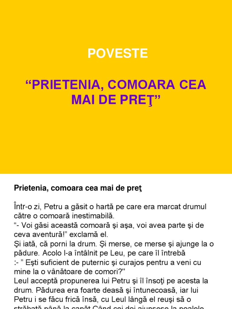Prietenia comoara cea mai de preţ într o zi petru a găsit o hartă pe care era marcat drumul către o comoară inestimabilă. Felicitări ați găsit comoara. Voi găsi această comoară şi aşa voi avea parte şi de ceva aventură exclamă el. într o zi petru a găsit o hartă pe care era marcat drumul cătreo comoară inestimabilă voi găsi această comoară şi aşa voi avea parte şi de cevaaventură exclamă el şi iată că porni la drum.