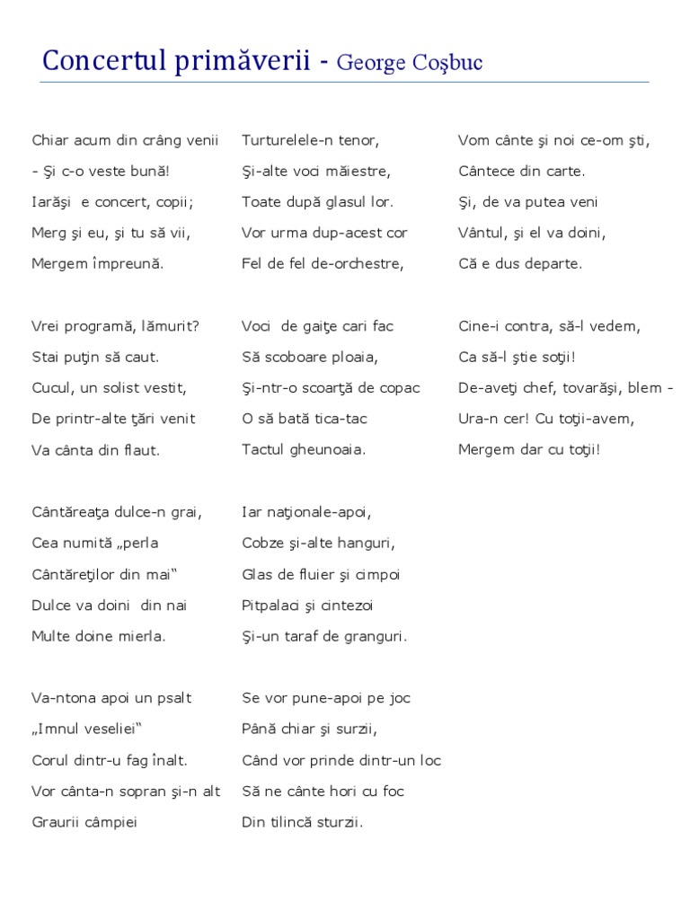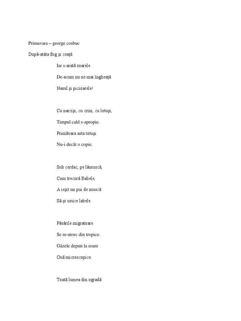 De acum nu ne mai ingheata nasul si picioarele. Noi isim pe camp afara fratii si surorile cand vin sarbatorile noua ne plac florile si privighetorile. Poezii de primavara george cosbuc vestitorii primaverii dintr alte tari de soare pline pe unde ati fost si voi straine veniti dragi pasari inapoi veniti cu bine. Mădălina oșan 539 views.