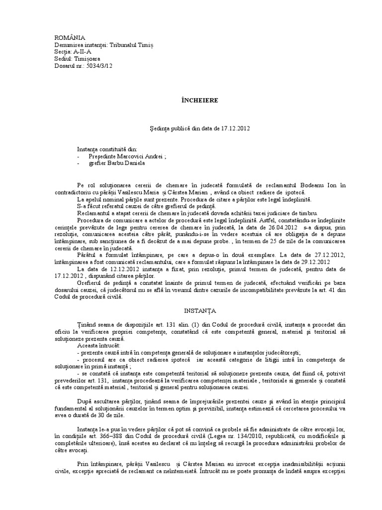 Dispune începerea judecăţii cauzei privind pe inculpata l. Invocarea excepţiei necompetenței materiale funcţionale după primul termen de judecată în condiţiile pronunţării unei încheieri interlocutorii prin care s a reţinut competenţa materială funcţională a instanţei iniţial învestite. O alta practica judecatoreasca. Se stabileşte de preşedintele instanţei sau de judecătorul de serviciu odată cu înregistrarea cererii de chemare în judecată.
