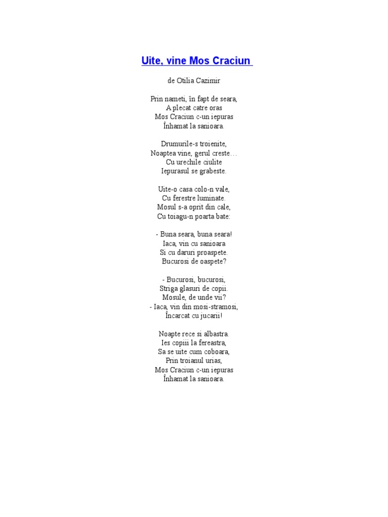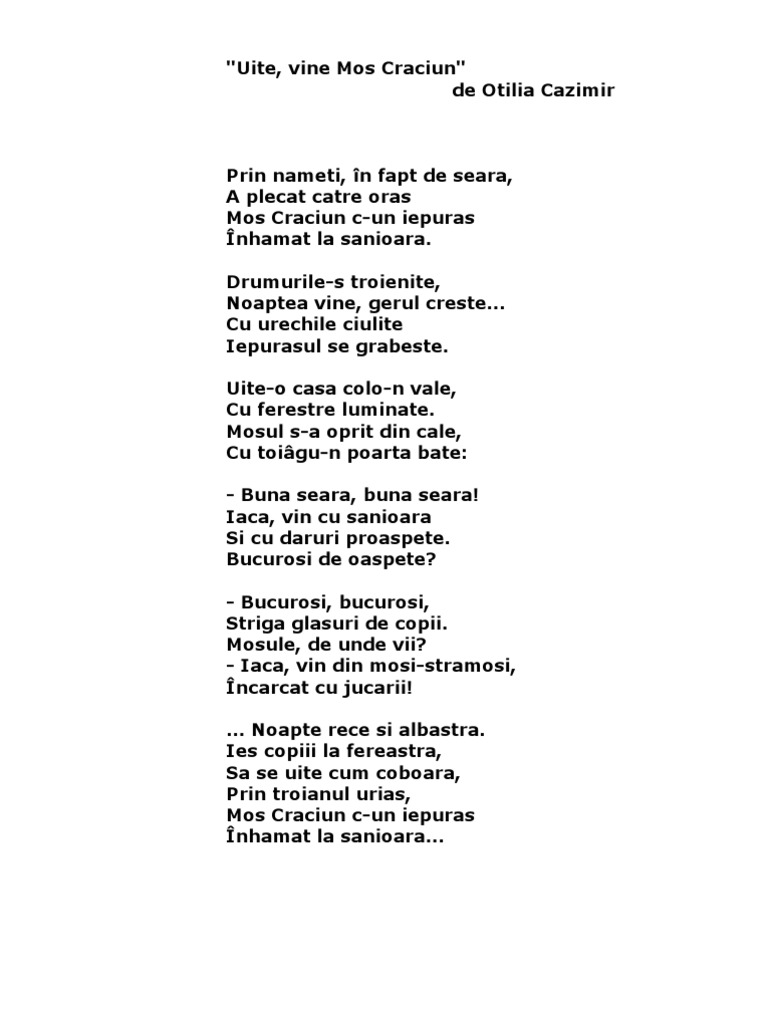 Uite o casa colo n vale cu ferestre luminate. Drumurile s troienite noaptea vine gerul crește. Drumurile s troienite noaptea vine gerul creste. Prin nămeți în fapt de seara a plecat către oraș moș crăciun c un iepuras înhamat la sănioară.