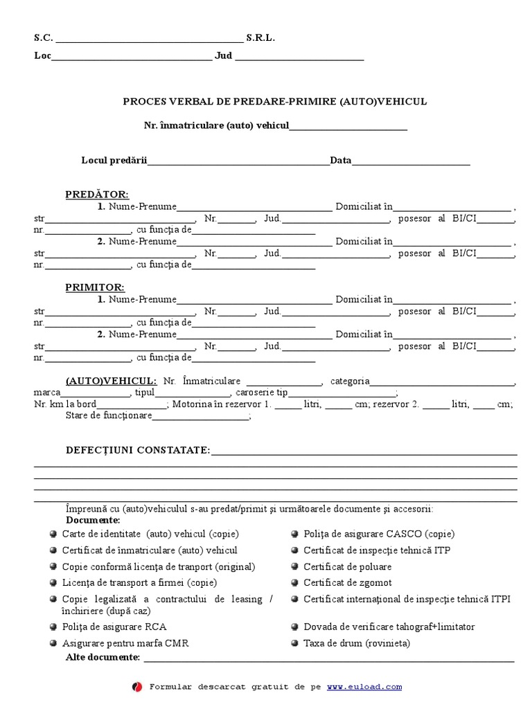 Vezi exemplu si descarca proces verbal de predare primire. Numitul cu adresa in. 0 0 voto positivo marcar este documento como útil 0 0 votos negativos marcar este documento como no útil insertar. Proces verbal de predare primire autovehicul daca o societate comerciala utilizeaza un autovehicul pentru indeplinirea activitatilor pe care le desfasoara in momentul in care angajatul conducator al autovehiculului il preda unui alt angajat pentru desfasurarea activitatii se va intocmi un proces verbal de predare primire autovehicul intre cele doua parti.