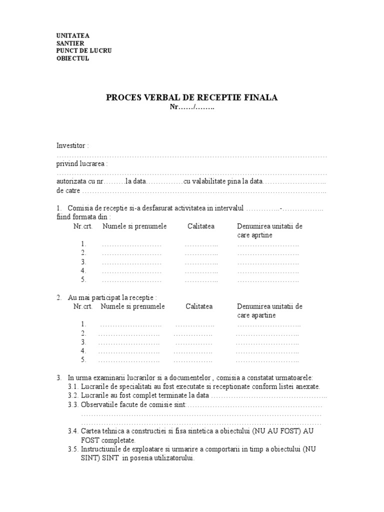 Proces verbal de receptie finala pdf. Nu au fost remediate aspectele consemnate în procesul verbal de suspendare a procesului de recepție finală inclusiv cele rezultate în urma expertizelor tehnice ridicărilor topografice încercărilor suplimentare probelor măsurătorilor și altor teste solicitate în termenul de remediere cuprinse în lista din anexa nr. Model proces verbal de receptie pdf proces verbal de receptie. 1 la prezentul proces verbal. Anexa 4 la regulament model proces verbal de receptie finala related posts descărcați fișa de date sintetice descărcați de mai jos fișa de date sintetice conform h g.