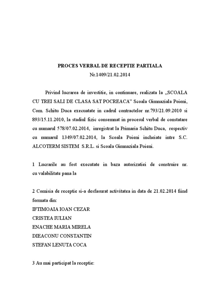 Proces verbal de receptie partiala. Acesta este un fragment din regulamentul privind recepția construcțiilor din 18 05 2017 cumpărați documentul în formă actualizată sau alegeți un abonament lege5 care permite accesul la orice formă actualizată. Am inteles ca pentru a amortiza in contabilitate materialele cumparate ar trebui sa fac un proces verbal de receptie partiala a lucrarilor. Proces verbal de receptie partiala a lucrarilor nr din. Privind lucrarea executata in cadrul contractului nrdin ncheiat ntre primaria oras buzias si ntre pentru lucrarile de.