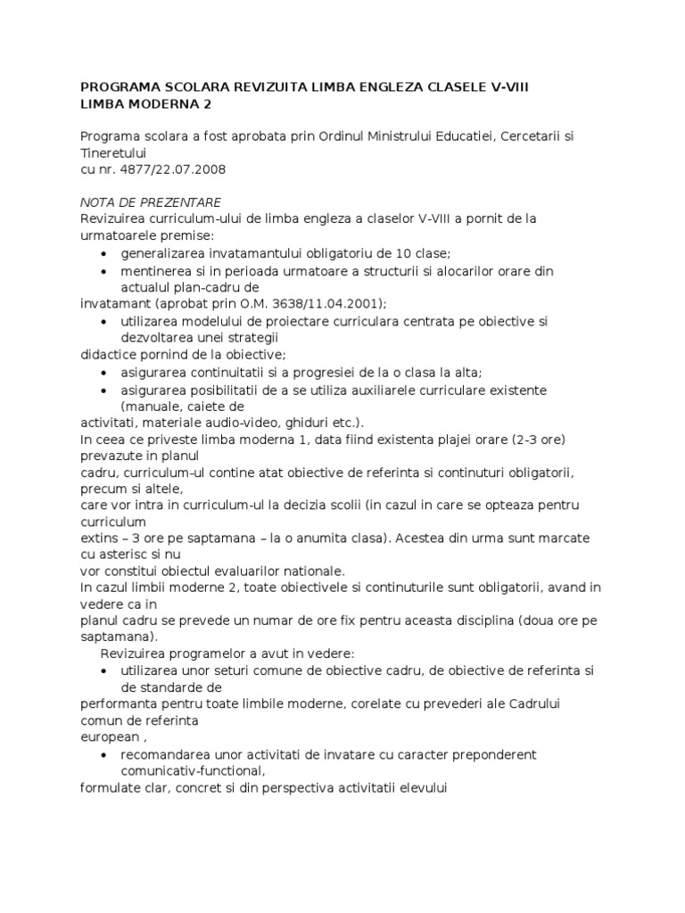 Programa pentru disciplina limba modernă 2 clasele a v a a viii a care conform planului cadru de învățământ are alocate 2 ore săptămână propune dezvoltarea unor competențe de comunicare care sunt compatibile cu nivelul a 2 1 conform cadrului europeancomun de referință pentru limbi cecrl la finalul ciclului gimnazial. Precizări privind aplicarea noilor programe pentru învățământul gimnazial programele şcolare pentru clasa a v a cuprinse în anexa 2 a omen nr. Programa şcolară limba engleză cls pregăitoare cls i cls a ii a. Limba italiană clasele a ix a a xii a.