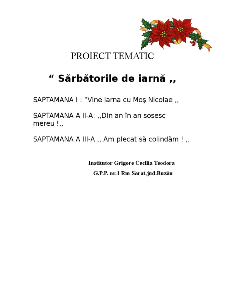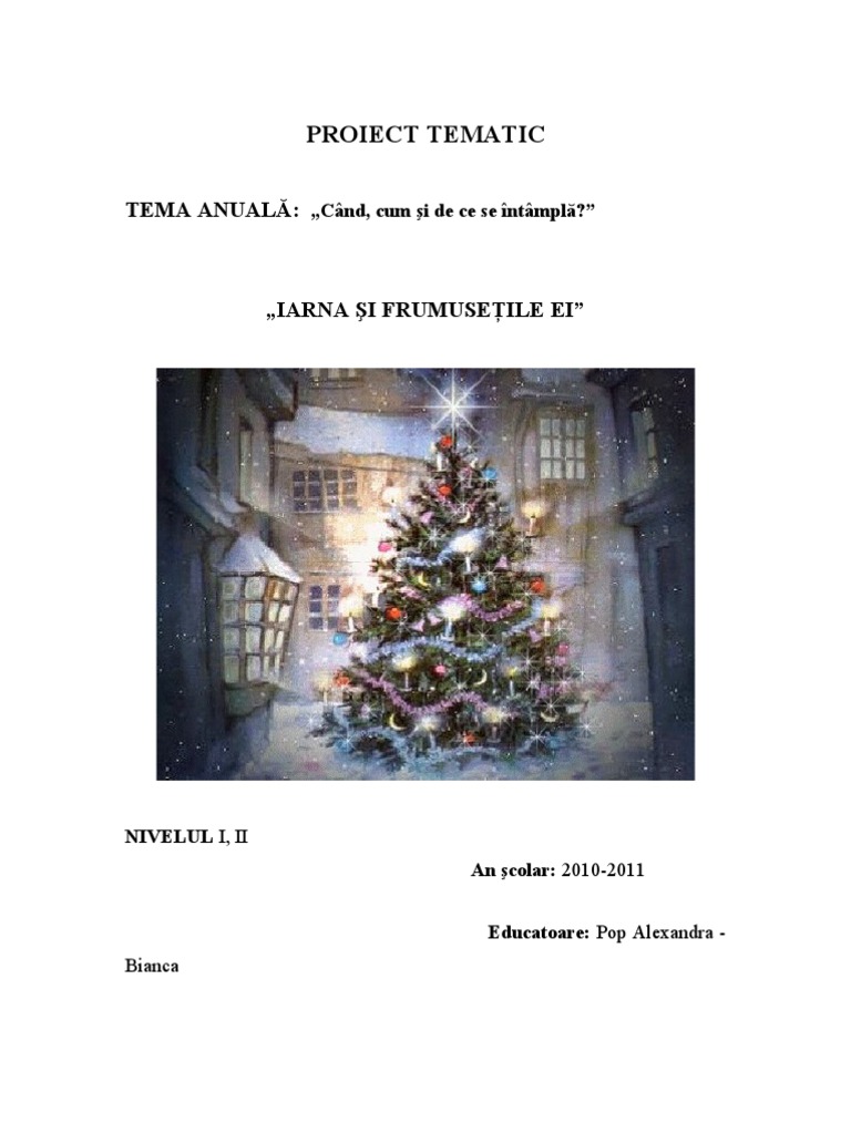 Proiect de activitate integrată magia sărbătorilor de iarnă data. Tema proiectului tematic. Este o perioada bogata in obiceiuri diferite de la o zona la alta avand in centru marile sarbatori crestine praznuite in aceasta perioada. Sarbatorile de iarna la romani incep odata cu prinderea postului craciunului 15 noiembrie si tin pana la sfantul ioan 7 ianuarie.