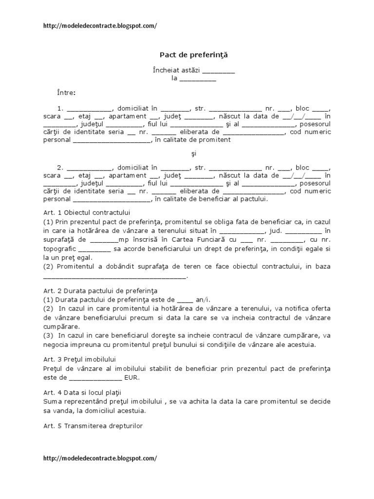 Pretul de vanzare al imobilului stabilit de parti prin prezenta promisiune unilaterala de vanzare este de lei euro. Model de antecontract de vânzare cumpărare a unui apartament numit și promisiune de vânzare cumpărare sau precontract model conform noului cod civil care se încheie în formă autentică la notariat. în continuare promitentul vânzător şi promitentul cumpărător vor fi denumiţi împreună părţile contractante. Data incheierii contractului de vanzare cumparare.