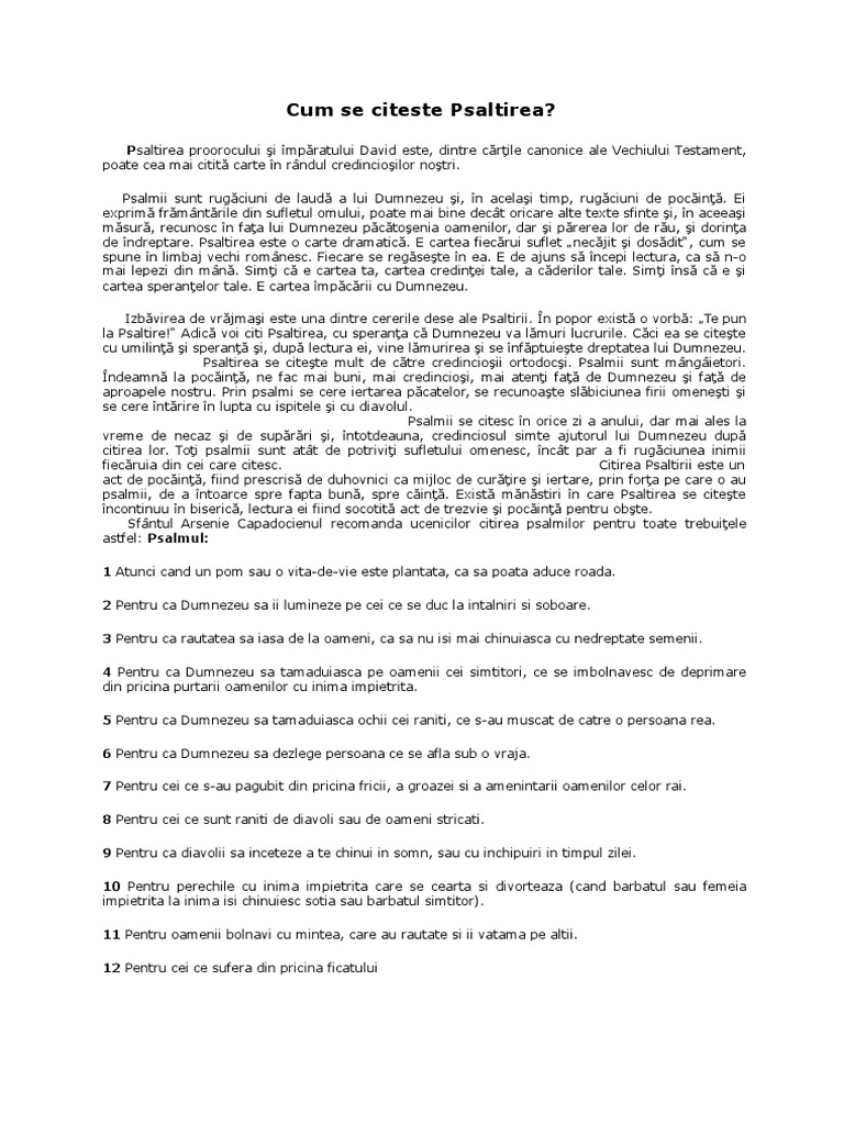 Ps 57 7 2 deşteptaţi vă alăută şi harpă mă voi trezi în zori de zi. Apoi se citeste psalmul. în loc să mă iubească mă cleveteau iar eu mă. Din indexul tematic de la sfarsit se aleg psalmii folositori in problema noastra generala sanatate de exemplu.