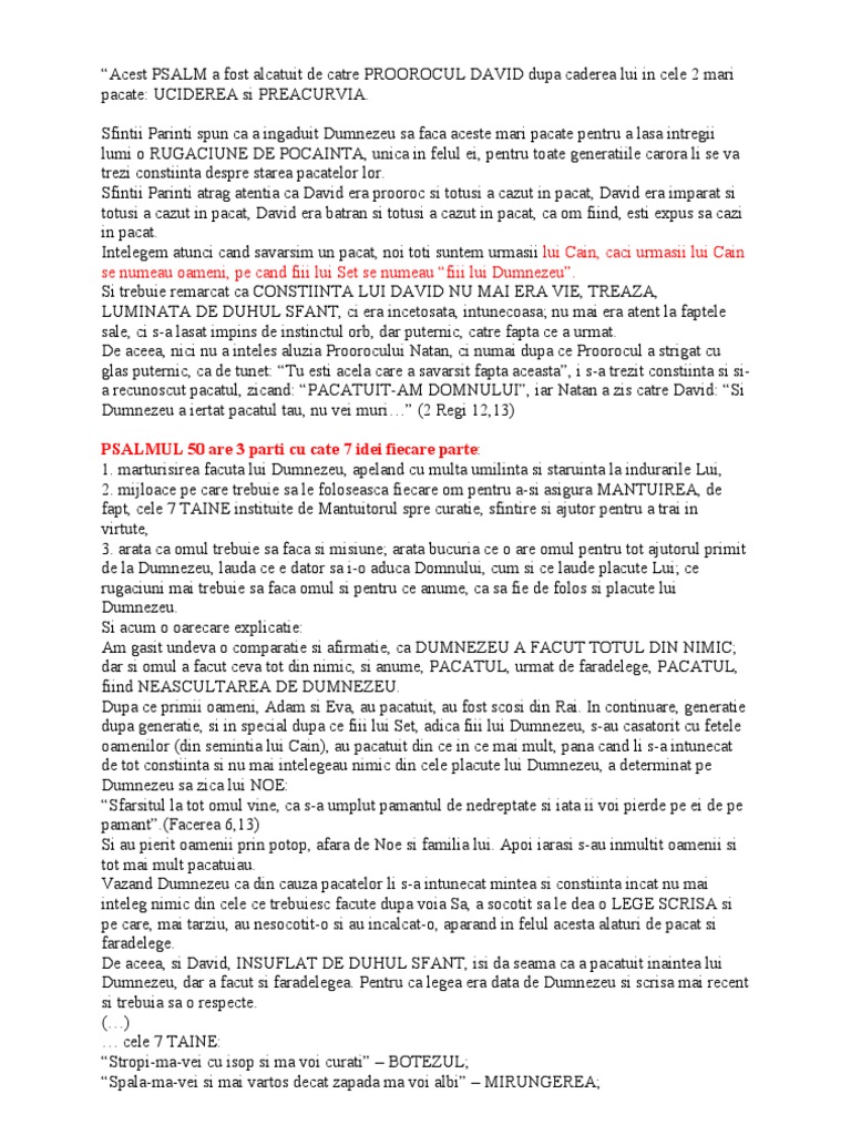 Psalmul 50 pentru ce se citeste. Psalmul 50 pentru ce se citeste. Creștinii pot citi la miezul nopții orice rugăciune doresc spunea sfântul ioan gură de aur dar nu trebuie să lipsească niciodată psalmul 50. Psaltirea este o carte a vechiului testament care cuprinde rugăciunile atribuite regelui david scrise sub inspiraţia duhului sfânt în forma unor psalmi adică stihuri în versuri fără rimă la origine cântate la harpă. Bucura se va limba mea de dreptatea ta.