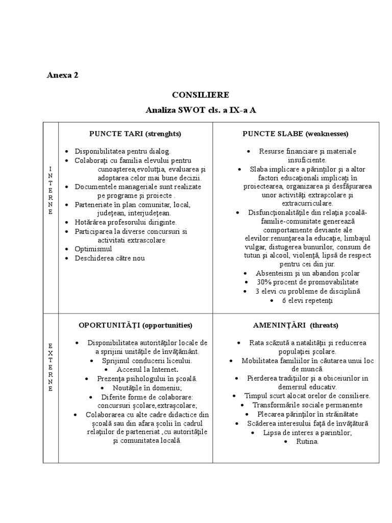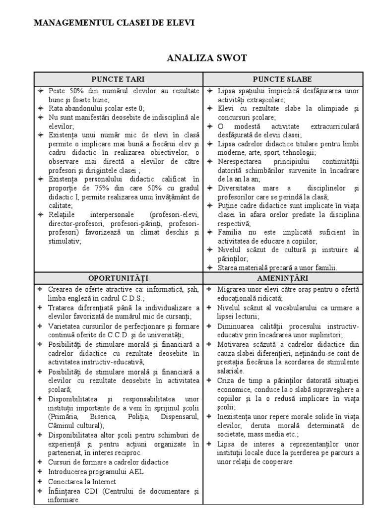 Puncte tari si puncte slabe ale unui elev. Swot provine din limba engleza si este un acronim pentru strenghts puncte tari weaknesses puncte slabe opportunities oportunitati si threats amenintari. Puncte tari majoritatea cadrelor didactice din comisie sunt titulare şi au absolvit cursuri de perfecţionare recente sau au susţinut examene de grad didactic. Clasa a v a clasa a. Pentru a adapta curriculum la cerinţele individuale ale unui elev cu dificultăţi de învăţare este deci firesc să identificăm.