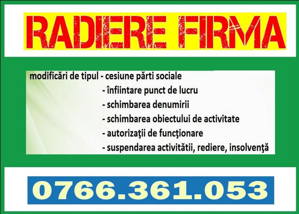 540 ron cost final toate etapele juridice incluse atentie. Inchidere firma fara activitate. Decizia asociatului unic de. Cererea de radiere se va completa de catre administratorul firmei sau o persoana desemnata si va contine informatii despre firma si cauza radierii dizolvare lichidare faliment nulitate incetare activitate sucursala.
