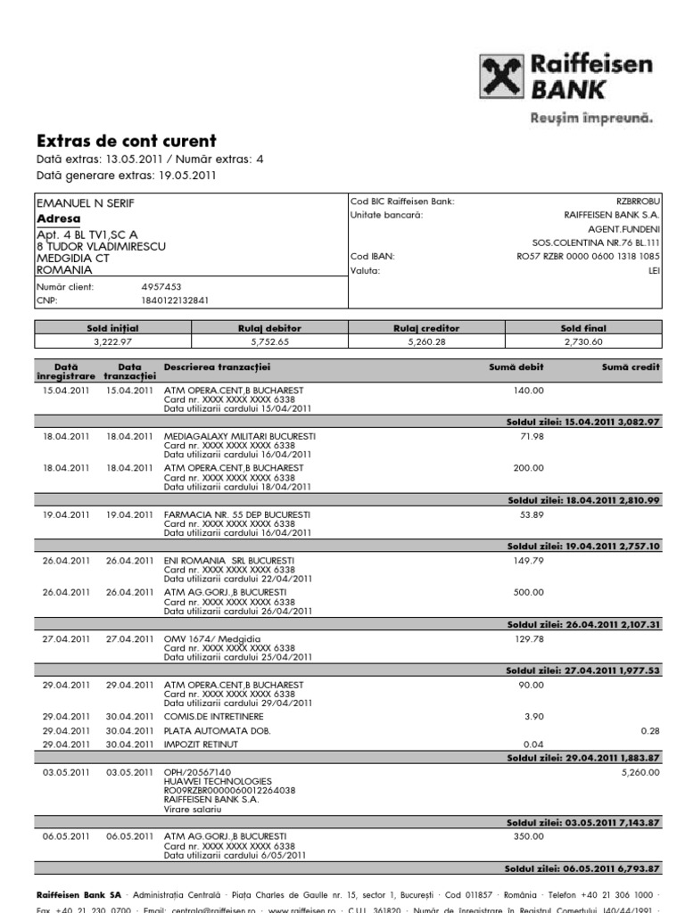 Cum imi pot. Extras de cont raiffeisen lunar prin posta. Puteti vizualiza extrasul de cont al bancii si prin serviciul de mobile banking sau de la atm urile bancii caz in care este disponibila doar o lista scurta a ultimelor operatiuni.