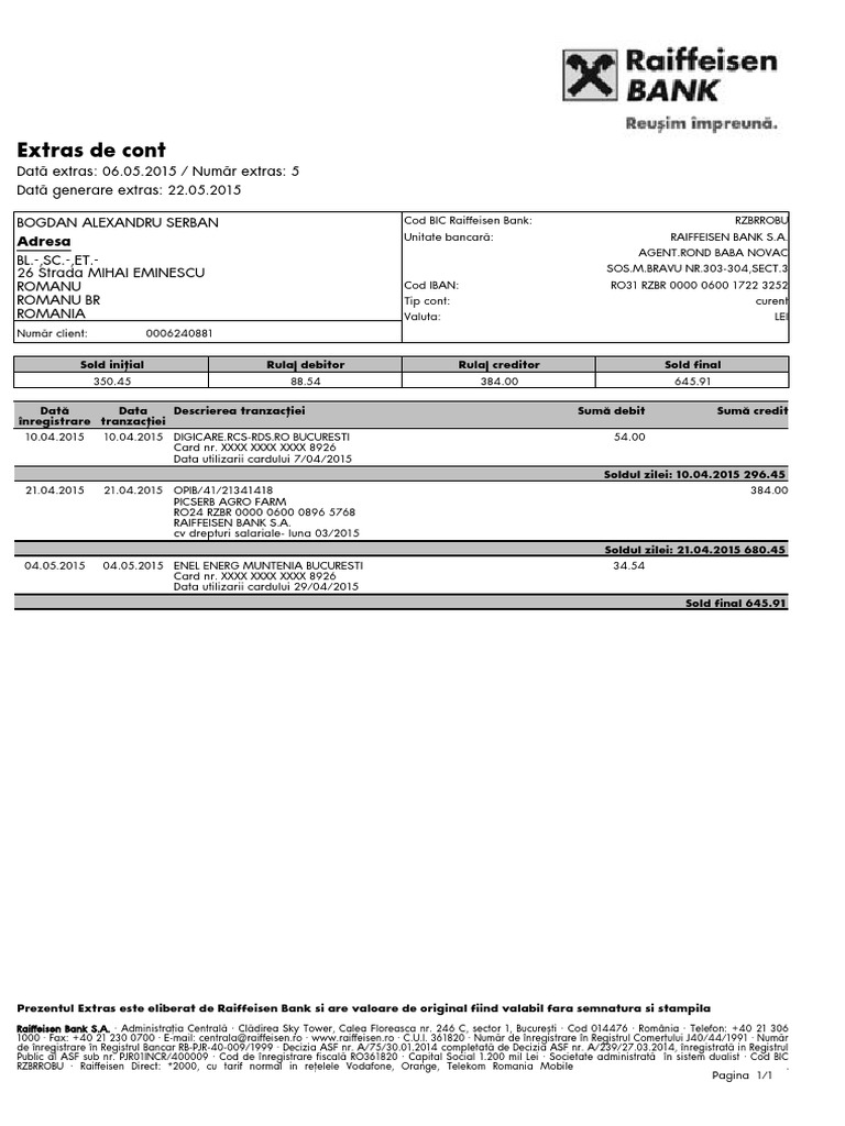 Raiffeisen extras de cont. Te asteptam in orice agentie raiffeisen bank si daca ai la tine actul de identitate in original noi iti facem rapid contractul. Extras electronic cod utilizator. Raiffeisenonline ro si afla toate conditiile pe care trebuie sa le indeplinesti pentru a putea beneficia de serviciul de internet banking oferit de raiffeisen bank. Asadar accesarea contului bancar online prin telefon sau la atm cu un card va ofera avantajul de a avea acces in orice moment si de oriunde la contul bancar fara a depinde de programul unei unitati bancare.