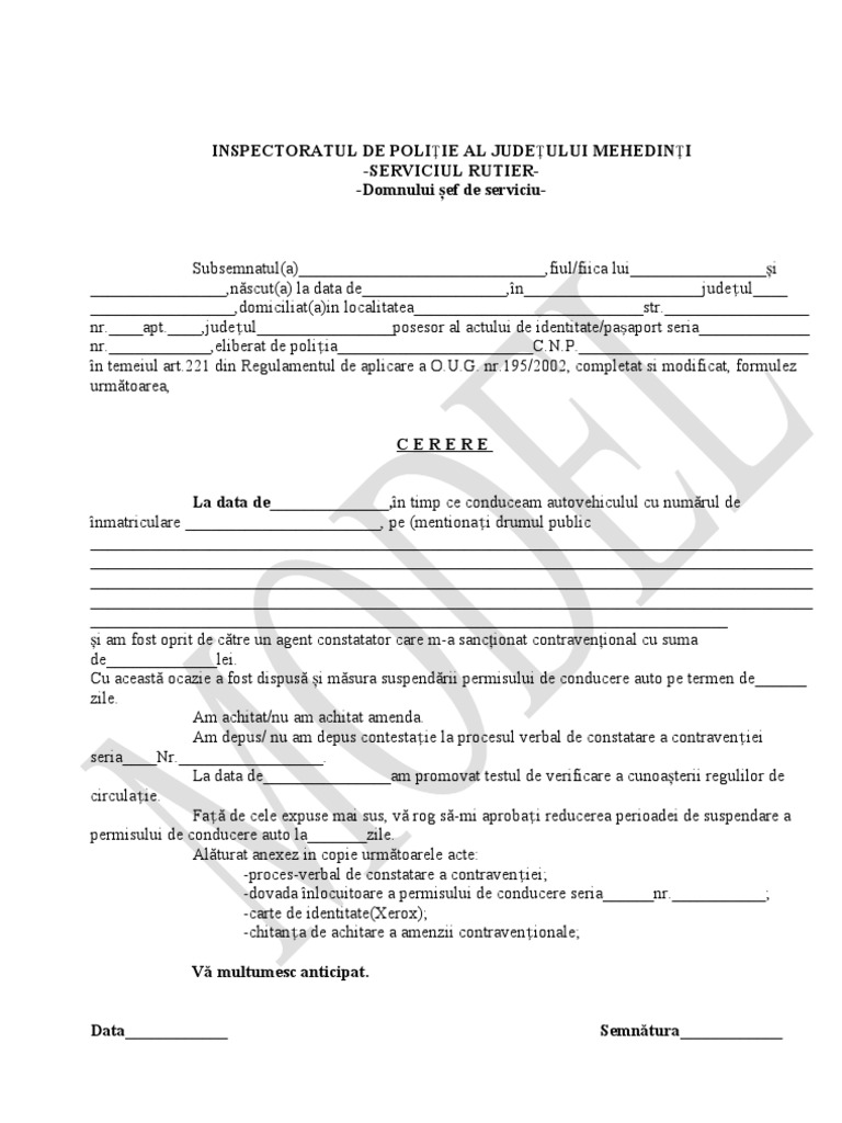 Reducere suspendare permis 90 zile. în cazul în care ai făcut o cerere de reducere a perioadei de suspendare examenul se va da în primele 30 de zile de suspendare inclusiv in a în a 30 a zi. C n p vă rog să aprobaţi reducerea perioadei de suspendare a exercitării dreptului de a conduce autovehicule pe drumurile publice la 30 de zile. Pentru a putea beneficia de reducerea perioadei de suspendare titularul trebuie sa indeplineasca urmatoarele conditii cumulativ. Legislația rutieră în vigoare stabilește că în funcție de contravenția săvârșită dreptul de a conduce al unui șofer se suspendă pentru 30 60 sau 90 de zile iar în urma testării cunoștințelor despre regulile de circulație această perioadă de suspendare a dreptului de a conduce se reduce la 30 de zile cu condiția îndeplinirii și restului de trei condiții despre.