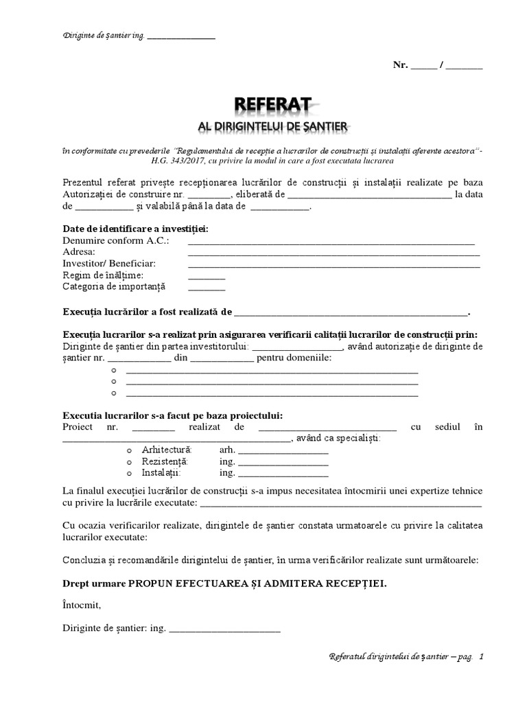 Referatul dirigintelui de santier incheiat astazi de catre dl d na. R e f e r a t al dirigintelui de şantier în conformitate cu prevederile regulamentului de recepţie a lucrărilor de construcţii şi instalaţii aferente acestora h g. 4 iunie 2019 în registrul diriginţilor de şantier autorizaţi de inspectoratul de stat în construcţii isc sunt înscrişi 26 628 de diriginţi de şantier. 343 2017 cu privire la modul în care a fost executată lucrarea.