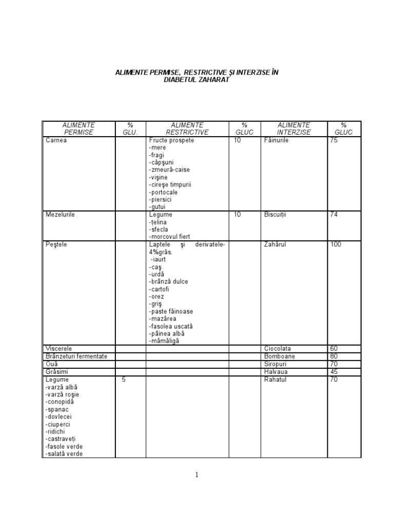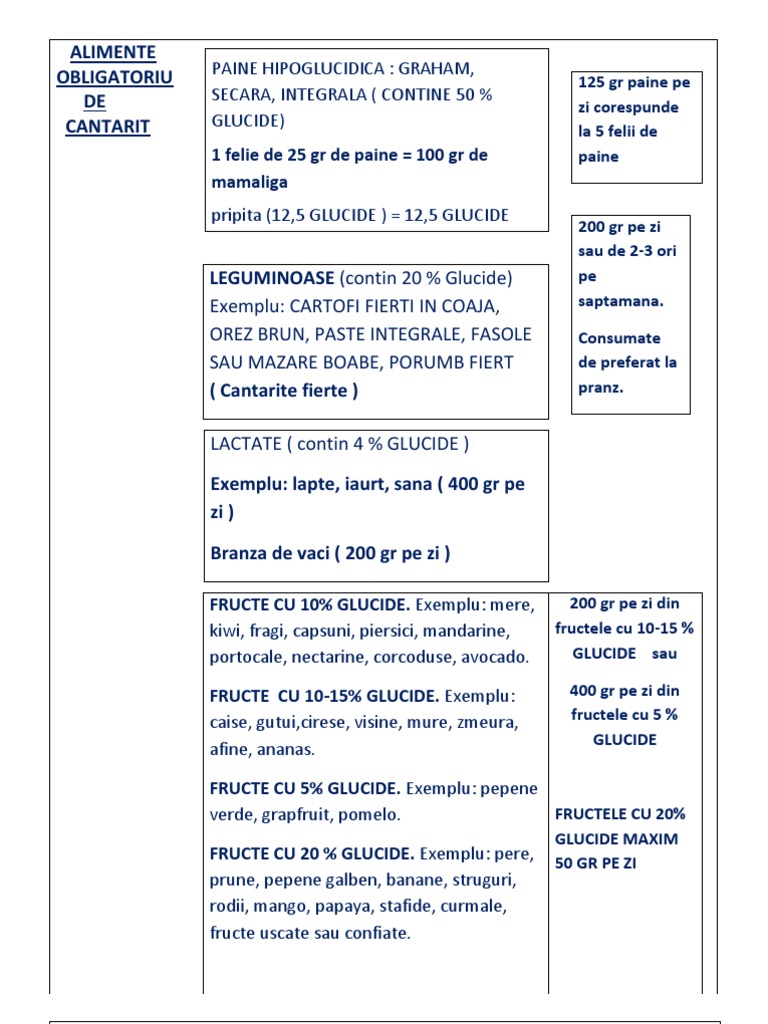 Pentru o mai bună organizare a regimului alimentar vom ține cont de conținutul de glucide în g al principalelor alimente informații pe care le puteți găsi aici.
