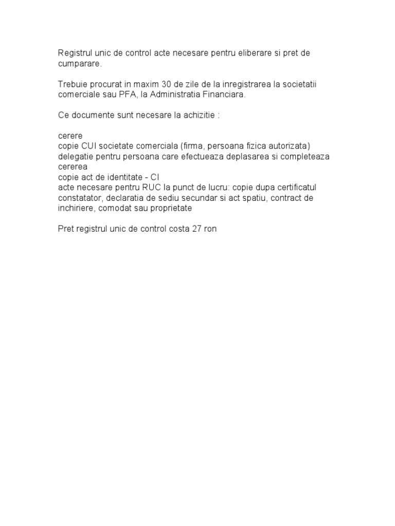 252 din 10 iunie 2003 privind registrul unic de control acesta are drept scop evidenţierea tuturor controalelor desfăşurate la contribuabil de către toate organele de control specializate în domeniile. Registrul unic de control de control registrul unic de control are ca scop evidentierea tuturor controalelor. Contribuabilii trebuie să achiziționeze registrul unic de control în termen de 30 zile de la data înregistrării de la direcțiile generale ale finanțelor publice din raza teritorială unde își are sediul social contribuabilul în baza unei documentații fiind necesară și o cerere. Registrul unic de control un rău necesar.