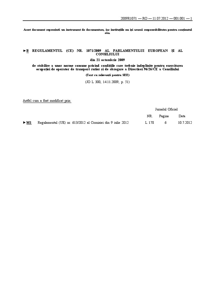 1071 2009 al parlamentului european și al consiliului din 21 octombrie 2009 de stabilire a unor norme comune privind condițiile care trebuie îndeplinite pentru exercitarea ocupației de operator de transport rutier și de abrogare a directivei 96 26 ce a consiliului text cu relevanță pentru see. 1024 2012 în vederea adaptării acestora la evoluţiile sectorului transportului rutier july 31 2020 transport atât la nivel naţional cât şi la nivel internaţional este în creştere. în consecinţă o serie. Din 21 octombrie 2009.