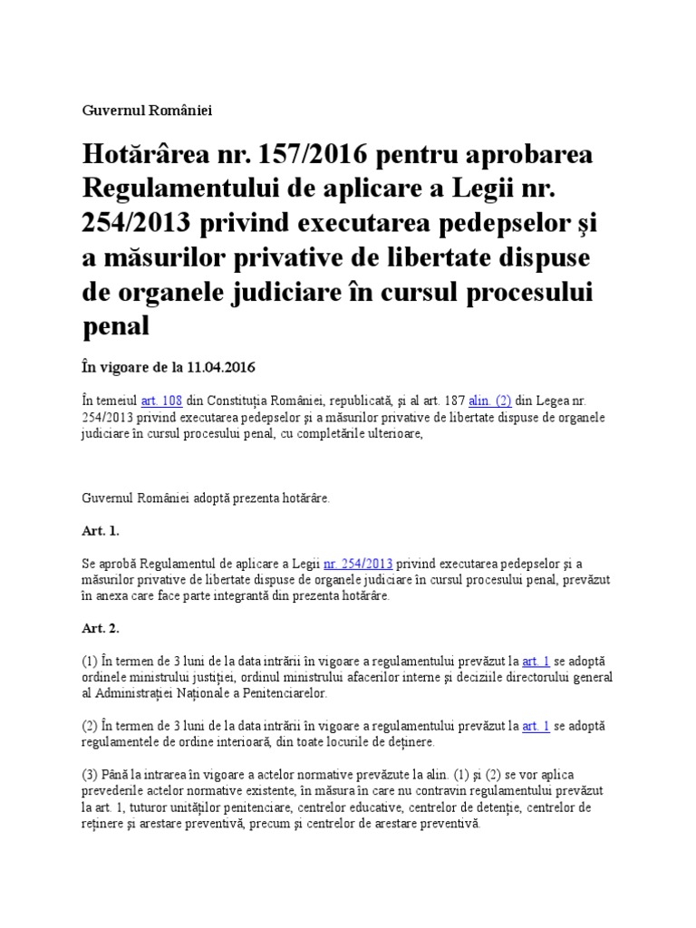 157 2016 pentru aprobarea regulamentului de aplicare a legii nr. 254 2013 privind executarea pedepselor şi a măsurilor privative de libertate dispuse de organele judiciare în cursul procesului penal denumită în continuare lege. A fost publicată hotărârea guvernului nr. 254 2013 privind executarea pedepselor și a măsurilor privative de libertate dispuse de organele judiciare în cursul procesului penal din 10 03 2016.