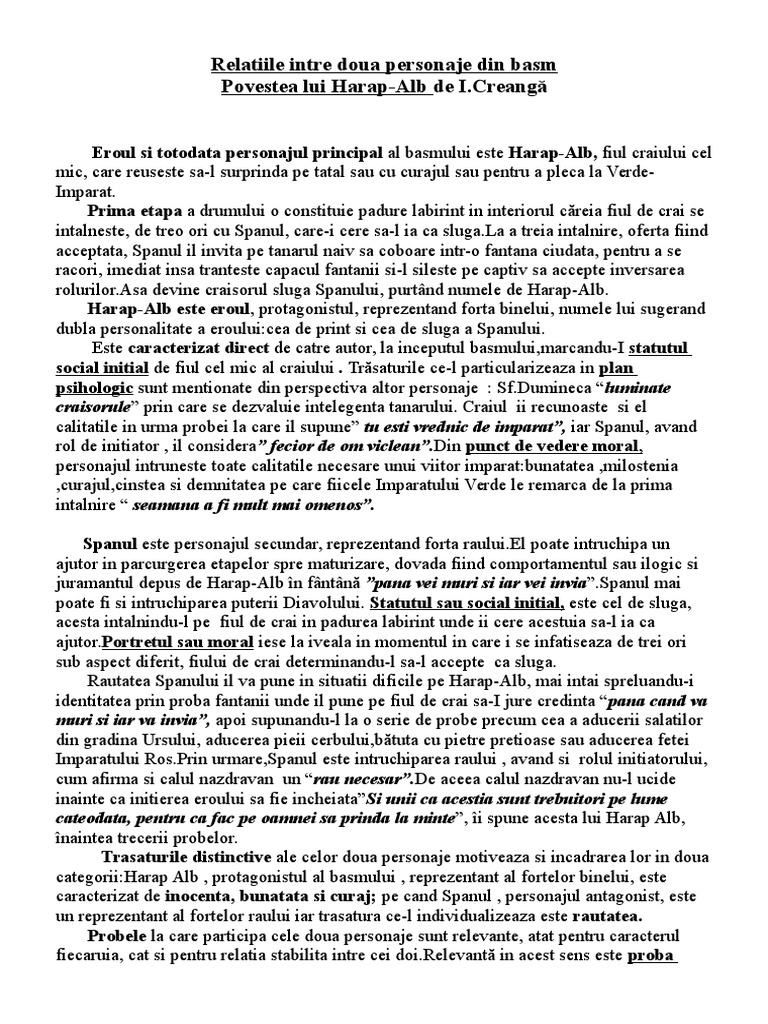 Dupa ce se infatiseaza de trei ori in fata fiului craiului de fiecare. Eseu relatia dintre doua personaje povestea lui harap alb. Relațiile dintre protagonist harap alb și antagonist spânul sunt și relațiile dintre inițiat și inițiator. Scrie un eseu de 2 3 pagini despre relatiile dintre dou.