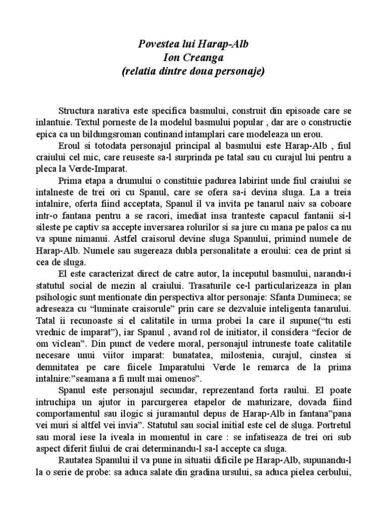 In opera harap alb personaje sunt tipologizate astfel. Read story harap alb relatia dintre doua personaje by mihaiuliniuc with 43 509 reads. Povestea lui harap alb de ion creanga este un basm cult ce apare in anul 1877 in revista convorbiri. Harap alb relația între două personaje relația harap alb spân povestea luiharap alb considerat a fi cel care a consacrat specia basmului în literatura română ion creangă preia în povestea lui harap alb convorbiri literare 1877 schema populară dar o umple de viață prin realismul abordării și prin atmosferă.