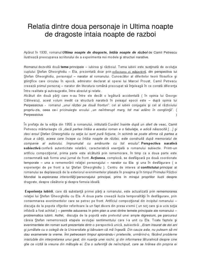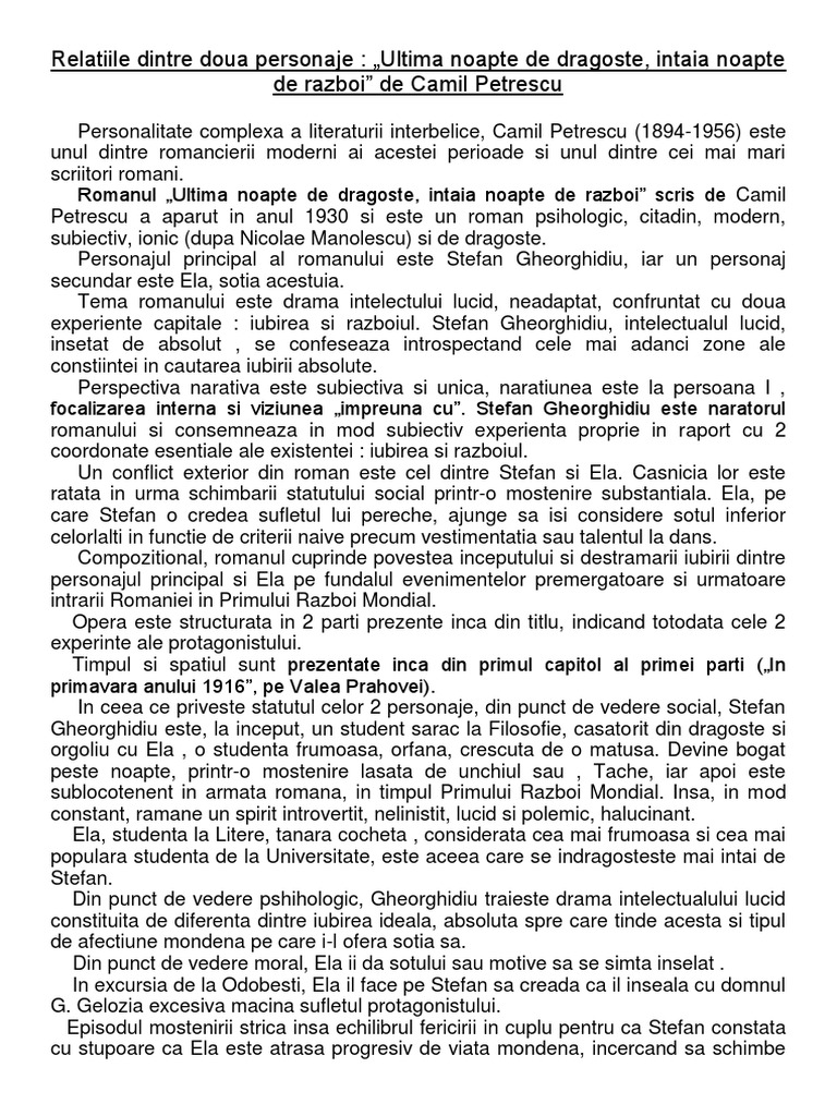 Vreau sa fie bine structurat si usor de retinut dau funda proza romanelor lui camil petrescu a produs un efect de modernizare a întregului roman românesc interbelic în sensul în care camil petrescu a promovat o literatură a subiectivităţii şi a. Eseu relatia dintre doua personaje ultima noapte de dragoste intaia noapte de razboi. Dupa ce se infatiseaza de trei ori in fata fiului craiului de fiecare. Ultima noapte de dragoste camil petrescu relatiile dintre doua personaje.