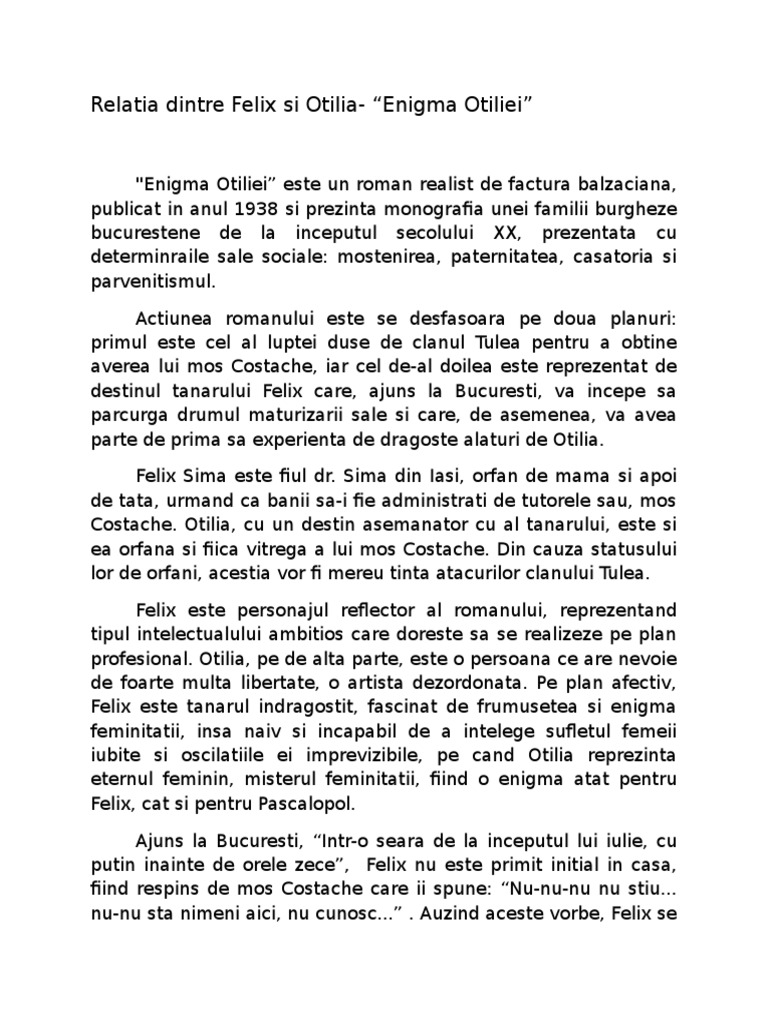 Relatia dintre felix si otilia. Statutul social al acesteia este incert ea fiind fata din prima căsătorie a celei de a doua soții a lui costache giurgiuveanu acesta amânând adoptarea ei după moartea mamei sale. Relația dintre cele două personaje felix sima și otilia mărculescu evoluează pe tot parcursul acțiunii luând diferite forme de la o simplă prietenie la o poveste de dragoste. Avand in otilia un tovaras de incredere felix rezista atacurilor. în puţinele studii despre roman scrise în perioada elaborării enigmei.