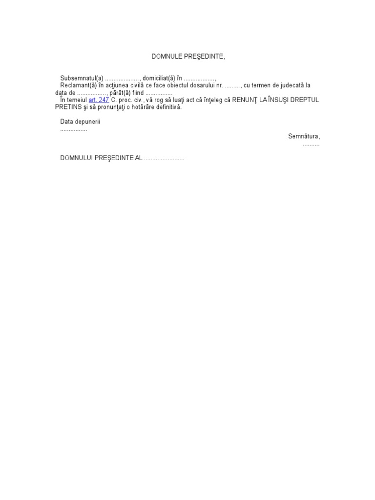 Jurisprudență reviste 9 doctrină 3 modele 2 1 reclamantul poate în tot cursul procesului să renunțe la însuși dreptul pretins dacă poate dispune de acesta fără a fi necesar acordul pârâtului. 408 c proc civ reclamantul poate in tot cursul procesului sa renunțe la însuși dreptul pretins dacă poate dispune de acesta renunțarea la dreptul pretins nu este condiționata de acordul paratului. 408 codul de procedură civilă conform căruia. De subsemnat prin actiunea introductiva de instanta formulata in acest dosar la data de.