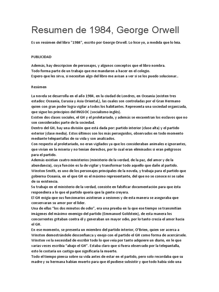 Resumen del libro 1984 de george orwell. Resumen de 1984 de george orwell. Para conquistarlo no hay nada en el mundo que no deba ser sacrificado y una vez alcanzado nada queda de importante en la vida a no ser la voluntad de conservarlo a cualquier precio. Publicado en 1949 un año antes de su muerte es considerada una de las obras más icónicas del siglo xx por su denuncia de las prácticas totalitarias llevadas a cabo por los dictadores de la época y que en cierta manera sigue presente en nuestros días. Resumen del libro 1984.