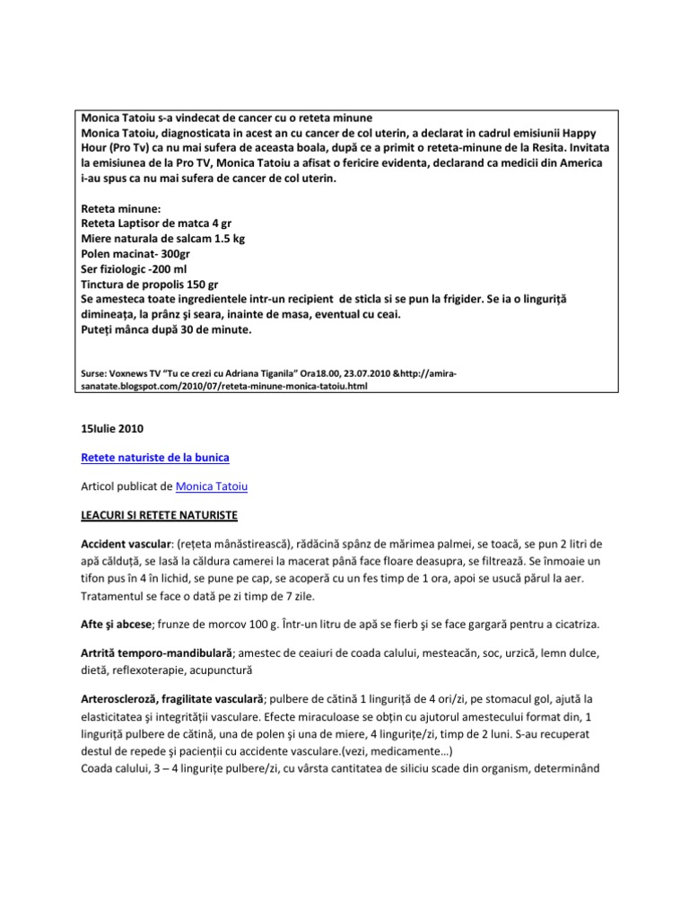 Miere de salcâm 1 5 kg polen crud 300 g lăptișor de matcă pur 10 g tinctură de propolis 150 ml reteta standard a d nei monica tatoiu impotriva cancerului este laptisor de matca pur 4 g miere de salcam naturala 1 5 kg polen 300 g. Lupta a fost crancena insa dorinta ei de a trai a fost mai puternica. Zilele trecute a fost invitata la emisiunea happy hour a lui maruta d na monica tatoiu care a dezvaluit cum anume a reusit ea sa treaca peste un diagnostic de cancer la san cu ajutorul unei retete miraculoase exclusiv pe baza de produse apicole. Reteta din produse apicole naturale a monicai tatoiu mentionata in cadrul emisiunii happy hour.