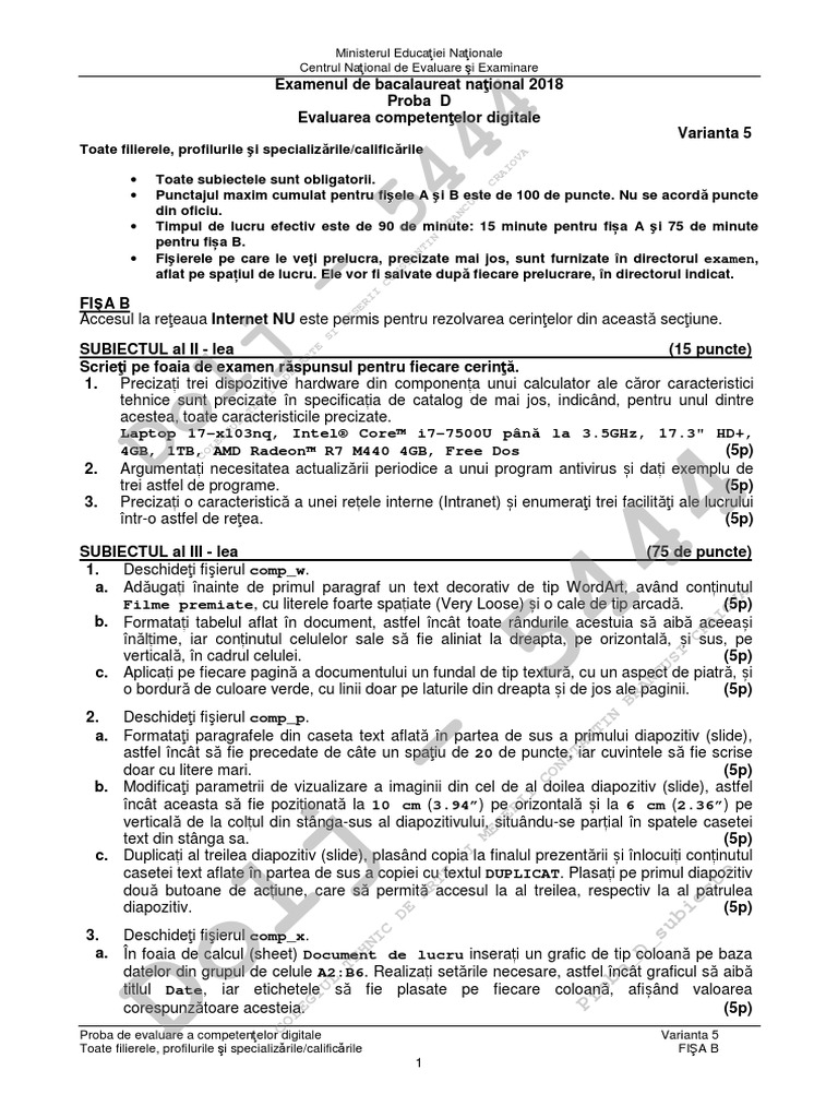 Rezolvarea corectă a cerinţei 5p. This entry was posted in modele de subiecte 2017 and tagged 2017 audio bac. Proba de evaluare a competenţelor digitale model toate filierele profilurile şi specializările calificările barem de evaluare şi de notare 2 2. Subiecte competențe digitale bacalaureat 2017 fișa b barem competențe digitale bacalaureat 2017 în zilele de 8 și 9 iunie va avea loc evaluarea competențelor lingvistice de comunicare orală în limba maternă pe 9 12 și 13 iunie evaluarea competențelor digitale iar pe 14 16 iunie evaluarea competențelor lingvistice într o limbă de circulație internațională.