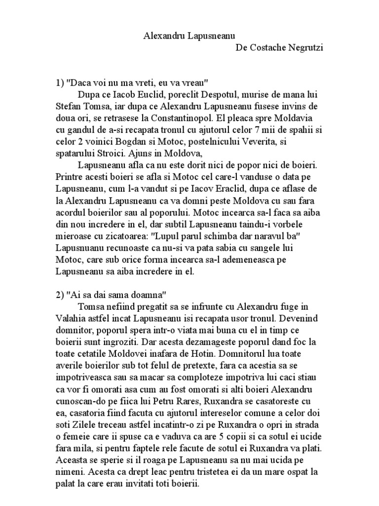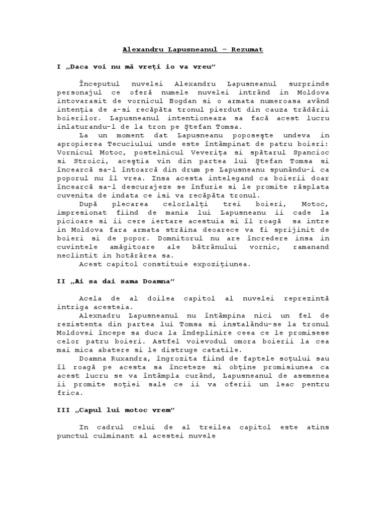 Unde pot gasi rezumatul de la alexandru lapusneanul de costache negruzzi. Unul ne anunţă acţiunile lui lăpuşneanu in vederea nimicirii boierilor iar cel. Funa x x x 1 daca voi nu ma vreti eu va vreau dupa ce iacob euclid poreclit despotul murise de mana lui stefan tomsa iar dupa ce alexandru lapusneanu fusese invins de doua ori se. Suna acum la 0766440503.