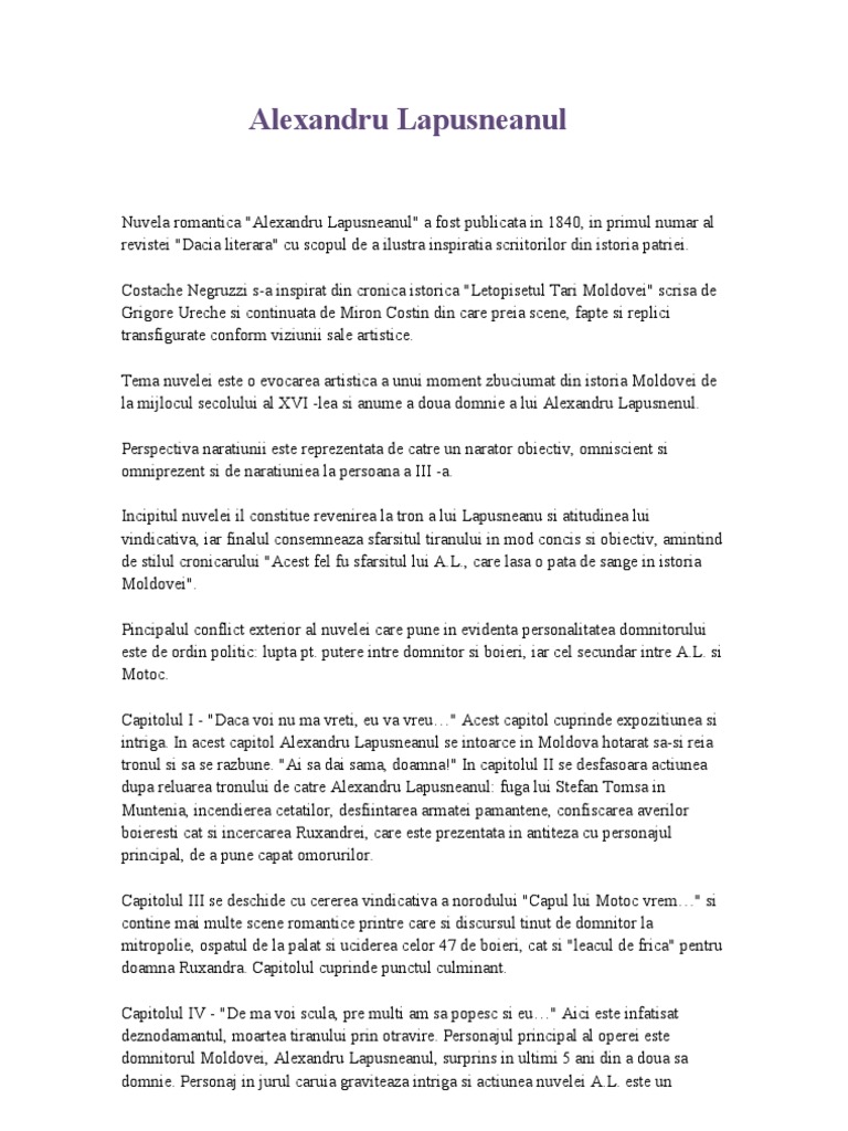 Rezumat alexandru lapusneanul pe scurt. Nuvela istorică alexandru lăpuşneanul este o lucrare pragmatică in care este evocată figura lui alexandru lăpuşneanul in cea de a doua domnie. Alexandru lapusneanul referat alexandru lapusnueanul de costache negruzzi comentariu literar baltagul rezumat pe capitole 71338 visits dorinta de mihai eminescu demmonstratie opera lirica 27402 visits caracterizarea comisului ionita 24518 visits. Alexandru lăpuşneanul ajutat de turci îşi recucereşte tronul şi hotărăște să i distrugă pe boierii nemulțumiți vinovaţi sau nu spre groaza doamnei ruxanda soția sa. Aceasta apare în primul număr al revistei dacia literară ṣi are la bază conform cerinţelor paṣoptiṣtilor o temă inspirată din istoria poporului român creionarea perioadei celei.