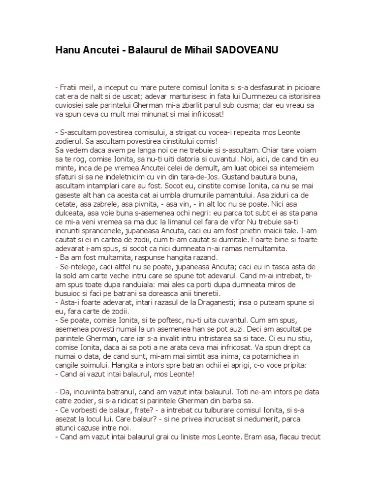 Include rezumate scurte pentru povestile iapa lui vodă. Rezumat scurt al romanului social baltagul scris de scriitorul român mihail sadoveanu si publicat in anul 1930 de către editura cartea românească din bucurești. Hanu ancutei de mihail sadoveanu mihail sadoveanu hanu ancutei balaurul este povestita de mos leonte care vazuse balaurul atunci cand era flacau trecut de douazeci de ani pe cand invata de la tatal sau mestesugul de zodier si vraci. Povestirea în ramă povestirea în povestire sau povestire cu cadru este o specie a genului epic în care se narează o situaţie neobişnuită iar personajele sunt conturate mai palid timpul narativ se situează într un plan al trecutului iar principala modalitate de.