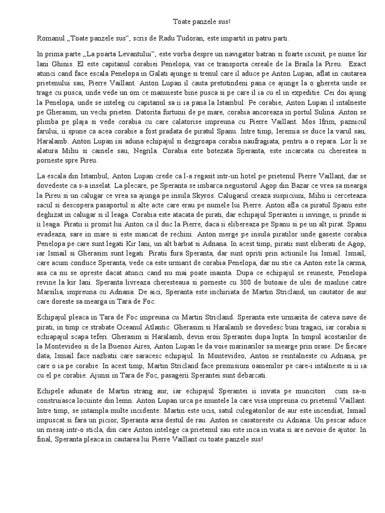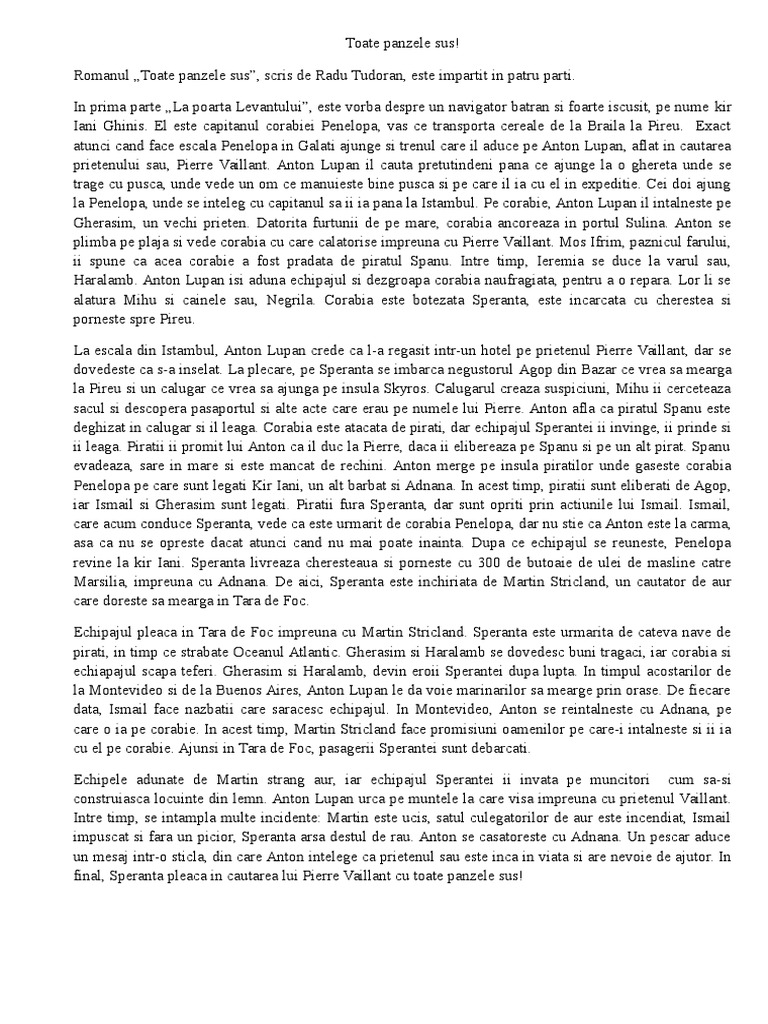 Toate panzele sus de radu tudoran rezumat pe parti 05 16 00 ndrey 0 comments a a toate panzele sus. Florin scrie un roman de mircea cartarescu rezumat încărcat de. Documente similare cu romana rezumat radu tudoran toate panzele sus. La poarta levantului pe la jumatatea lunii martie in 1881 corabia greceasca penelopa cobora la vale pe bratul din mijloc al dunarii incarcata cu cereale indreptandu se catre pireu.