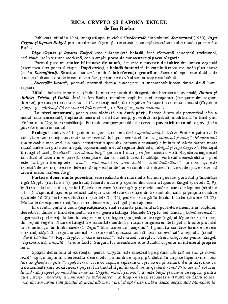Riga crypto si lapona enigel comentariu literar. Limba si literatura romana profil mate info programa pentru bacalaureat 2020 riga crypto şi lapona enigel de ion barbucontextul apariţiei. Teorie poemul este specia literara a genului epic cu dimensiune mai ampla decat balada in care se prezinta faptele unor personaje cu suflet nobil. Riga crypto si lapona enigel este subintitulata balada insa rastoarna conceptul traditional realizandu se in viziune moderna ca un amplu poem de cunoastere si poem alegoric. Poezia riga crypto şi lapona enigel de ion barbu face parte din ciclul uvedenrode ce aparţine volumului joc secund 1930 şi are valoare de simbol pentru creaţia poetică ulterioară.